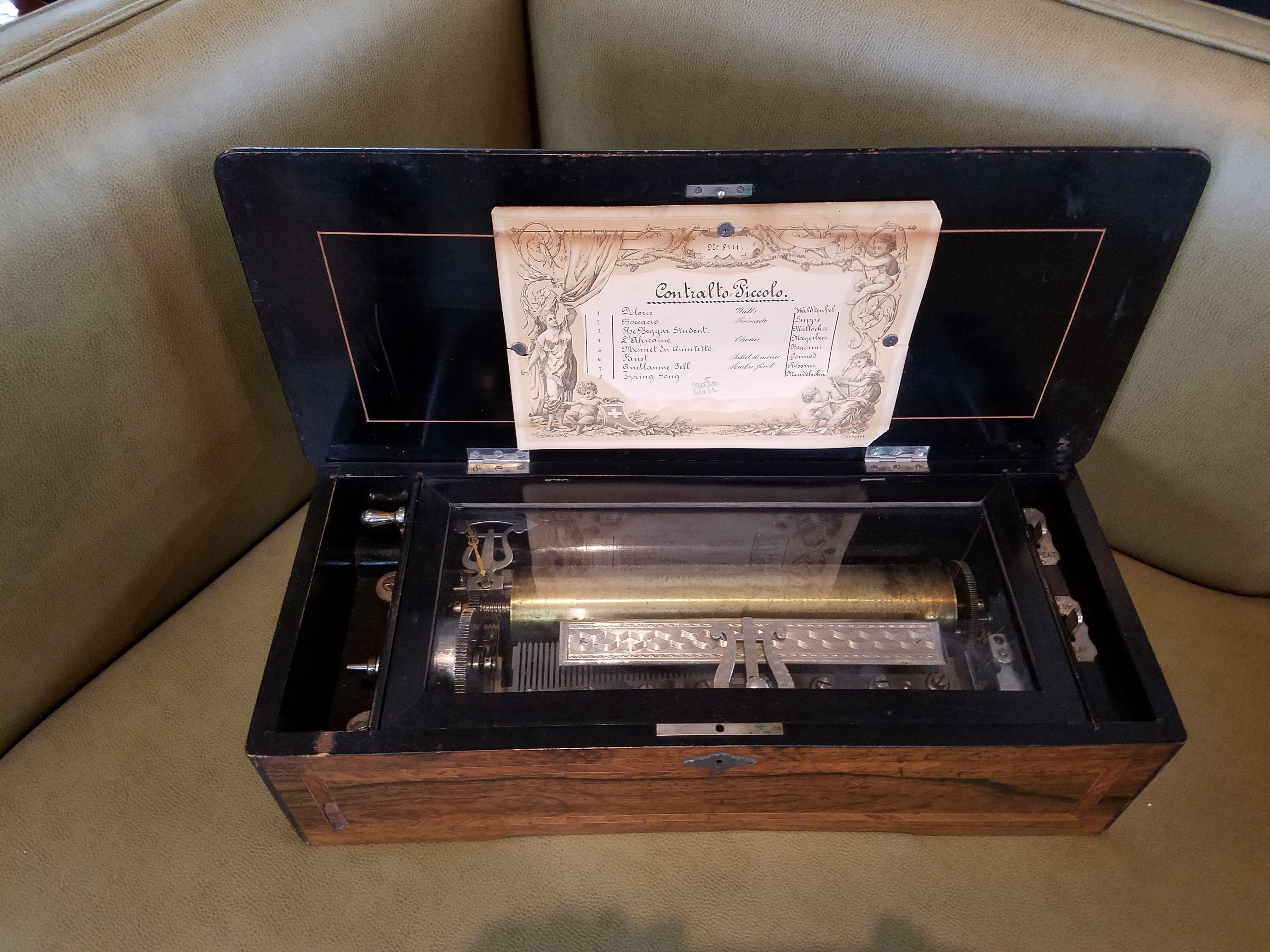 Get the best deals on antique music box when you shop the largest online selection at ebay. com. free shipping on many items browse your favorite brands affordable prices. Play the music box, thus rotating the cylinder, allowing for complete cleaning of the cylinder and all mallet-spikes. discard cotton swabs as they become visibly soiled. go over all parts a second time with a cotton swab moistened with distilled water to remove all traces of vinegar from metal parts. Part 2. purchasing an antique swiss cylinder music box "this baby has 450 horses under the hood! " the used car salesman says with a winning grin. there's a similar pitch tossed by the antique music boxe salesman, and it goes like this: "this box plays twenty tunes! ". Custom-made music boxes. these are fine mechanical musical mechanisms or discs and not digital music. creating a personalized cylinder or disc music box with a custom song is a time-consuming and dedicated process. cylinder music boxes use perfectly placed pins on a rotating metal cylinder that come up under the comb and strike the appropriate.
